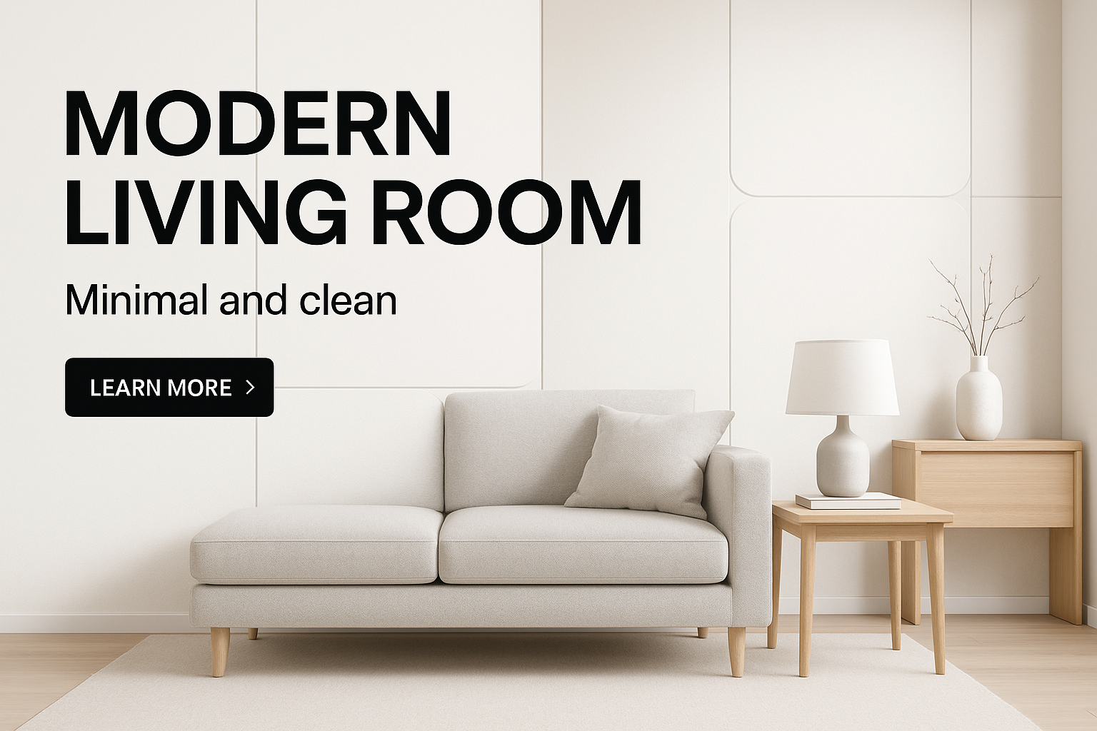 /Collection: /by davooda/Type: PNG/A modern minimalist living room featuring a sleek sofa, a wooden side table, and elegant decor. The layout includes bold typography and a call-to-action button, emphasizing clarity and professionalism.