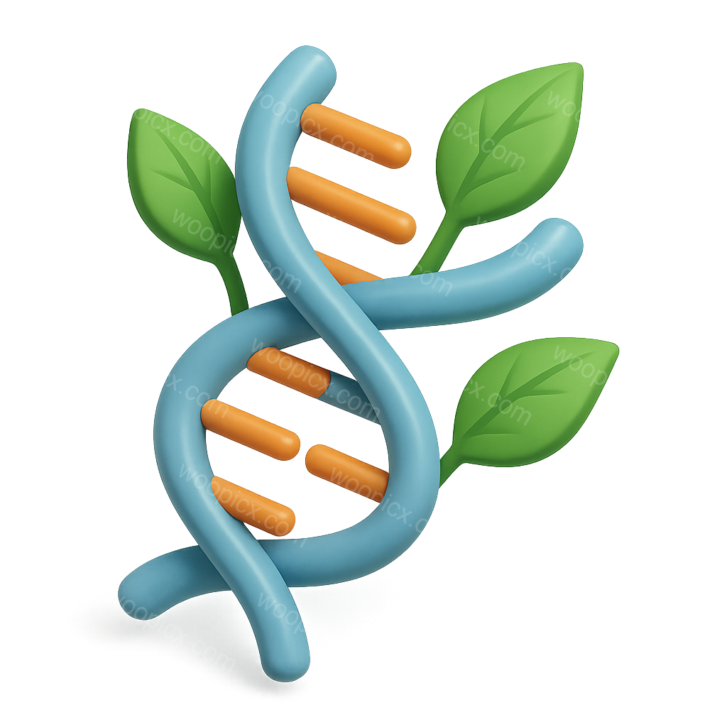 This image features a vibrant 3D icon of a DNA strand intertwined with green leaves. The design emphasizes a volumetric and isometric style, showcasing a transparent background.