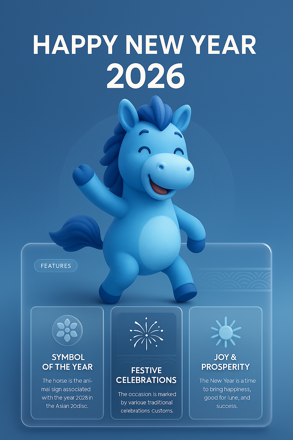 A cheerful blue horse symbolizes the year 2026 in the Asian zodiac, greeting the New Year with festive elements and a joyful expression. The design features a clean layout with highlighted features.