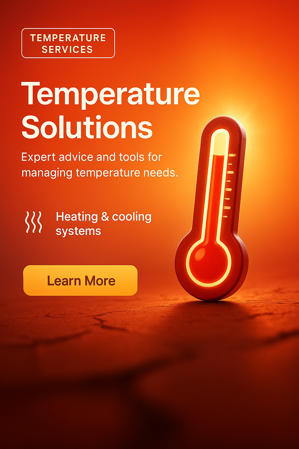 /Collection: /by davooda/Type: PNG/This vibrant promotional banner focuses on temperature management services. It features a stylized thermometer against a warm background, ideal for attracting potential customers.