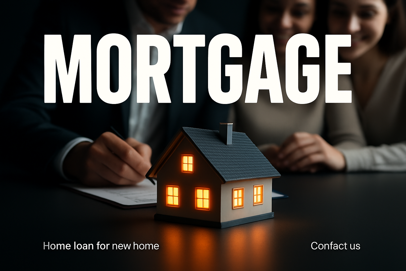 /Collection: /by davooda/Type: PNG/A close-up of a mortgage agreement being signed by a realtor and a couple, with a detailed miniature house in the foreground. The composition features a dark background, emphasizing modern typography and a cinematic feel.