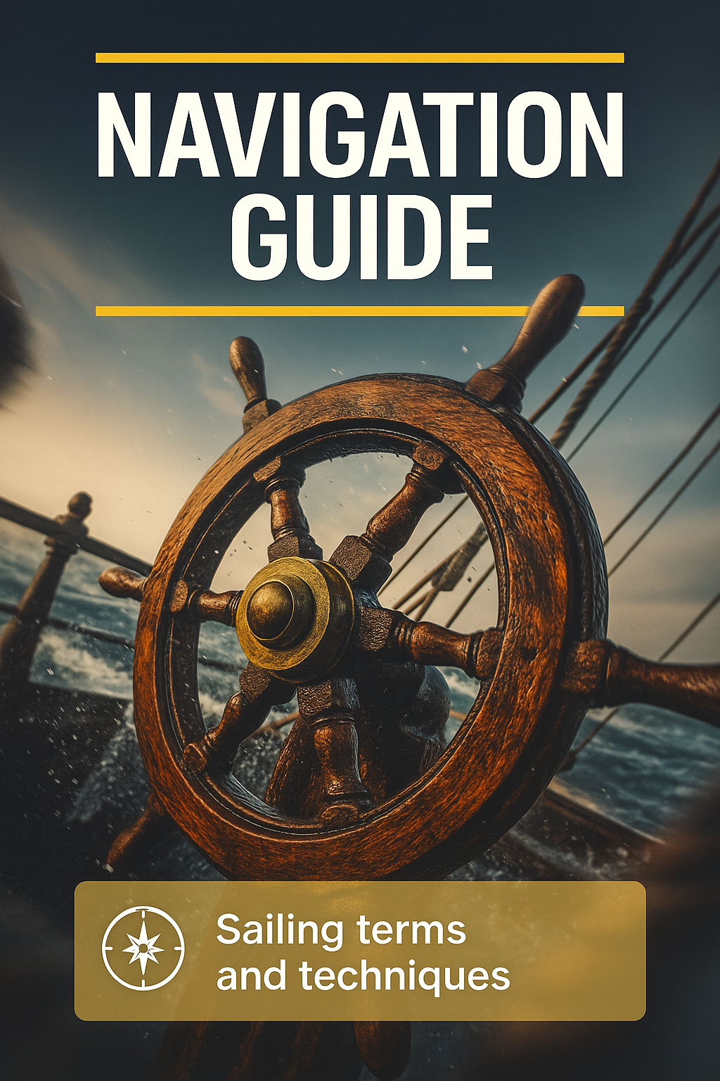 A dramatic view of a ship's wheel against a stormy sea backdrop, featuring a navigation guide title and sailing terms. The composition emphasizes movement and depth.