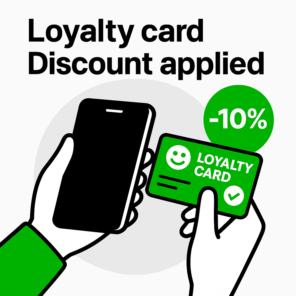 Vibrant promotional graphic showcasing a loyalty card discount offer, featuring modern design elements and a clear call-to-action, ideal for marketing campaigns.