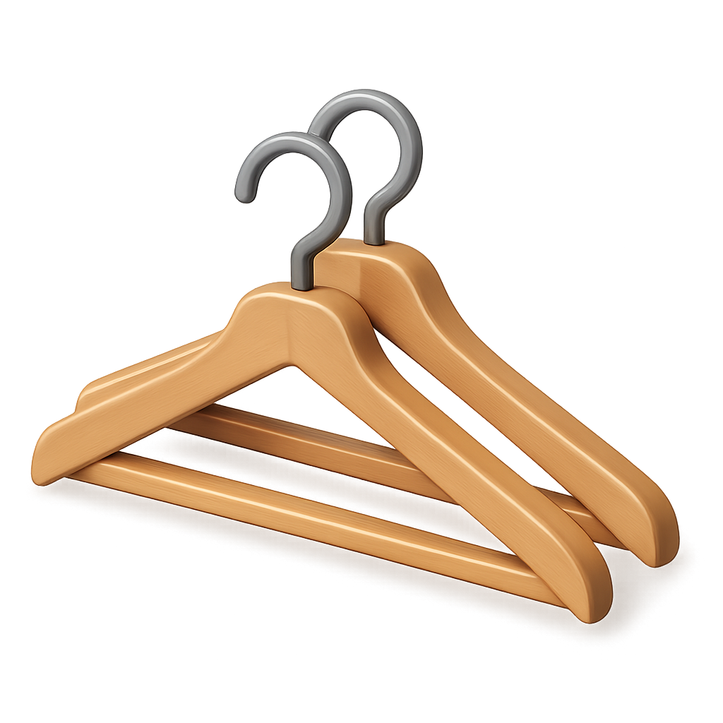 This image features three stylish wooden clothes hangers rendered in 3D with a transparent background. The hangers are depicted from a three-quarter view, showcasing their sleek design and volumetric appearance.