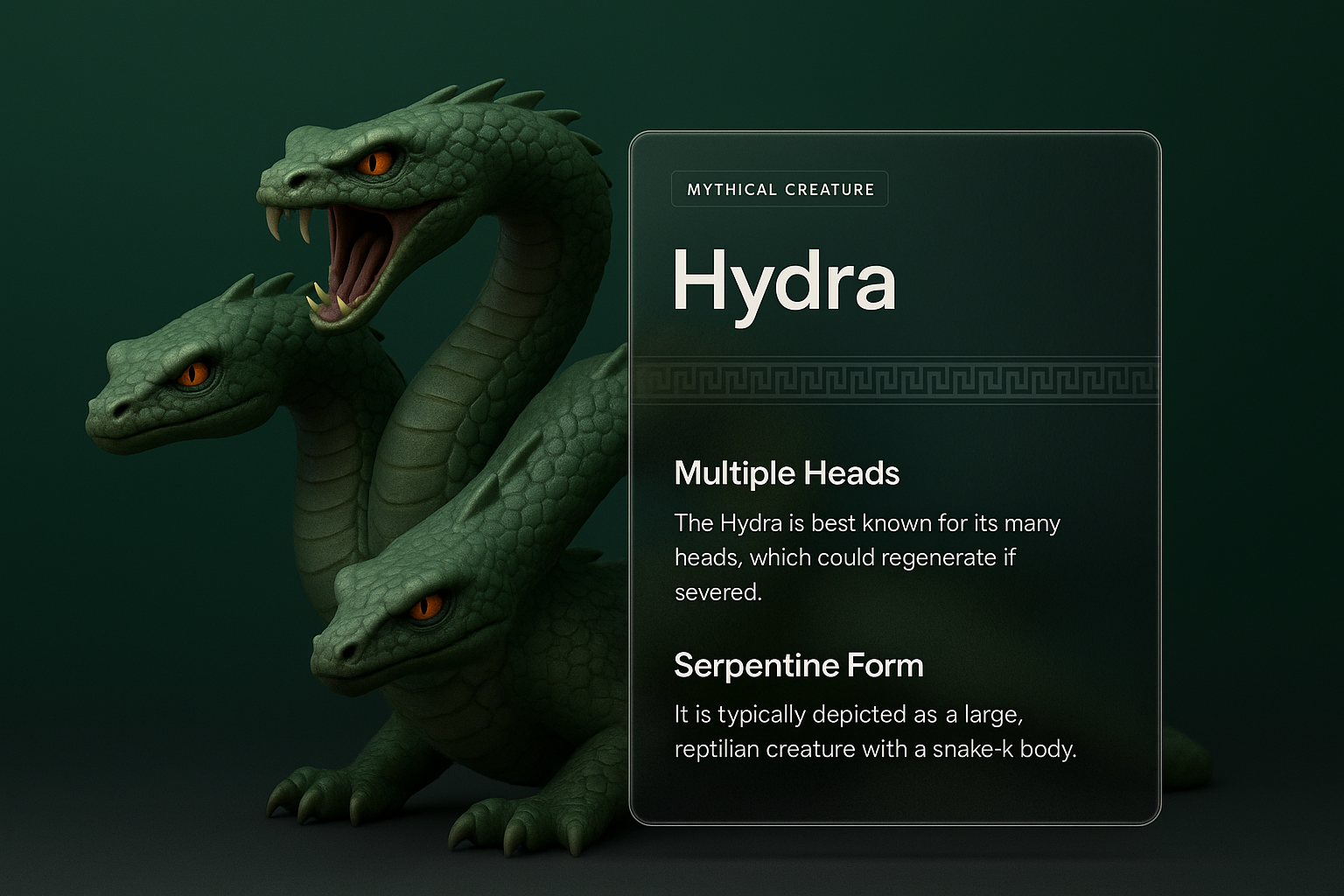 /Collection: /by davooda/Type: PNG/A visually striking 3D illustration of a Hydra, featuring multiple heads and a serpentine body. Integrated information panels provide details about the creature, enhancing the design.