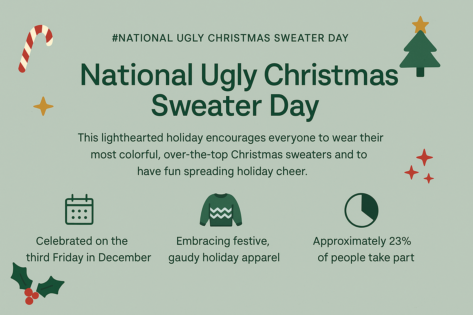 /Collection: /by davooda/Type: PNG/Informative graphic celebrating National Ugly Christmas Sweater Day with festive design elements, suitable for social media sharing and holiday promotions.