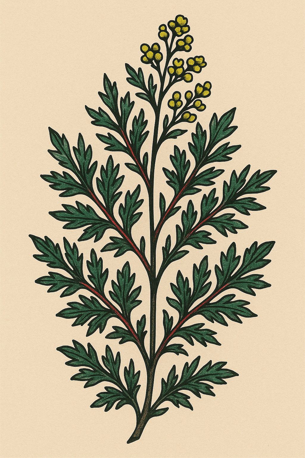 This image features a detailed botanical illustration of a green plant with yellow flowers, showcasing intricate leaf patterns and natural colors. Ideal for educational or decorative purposes.