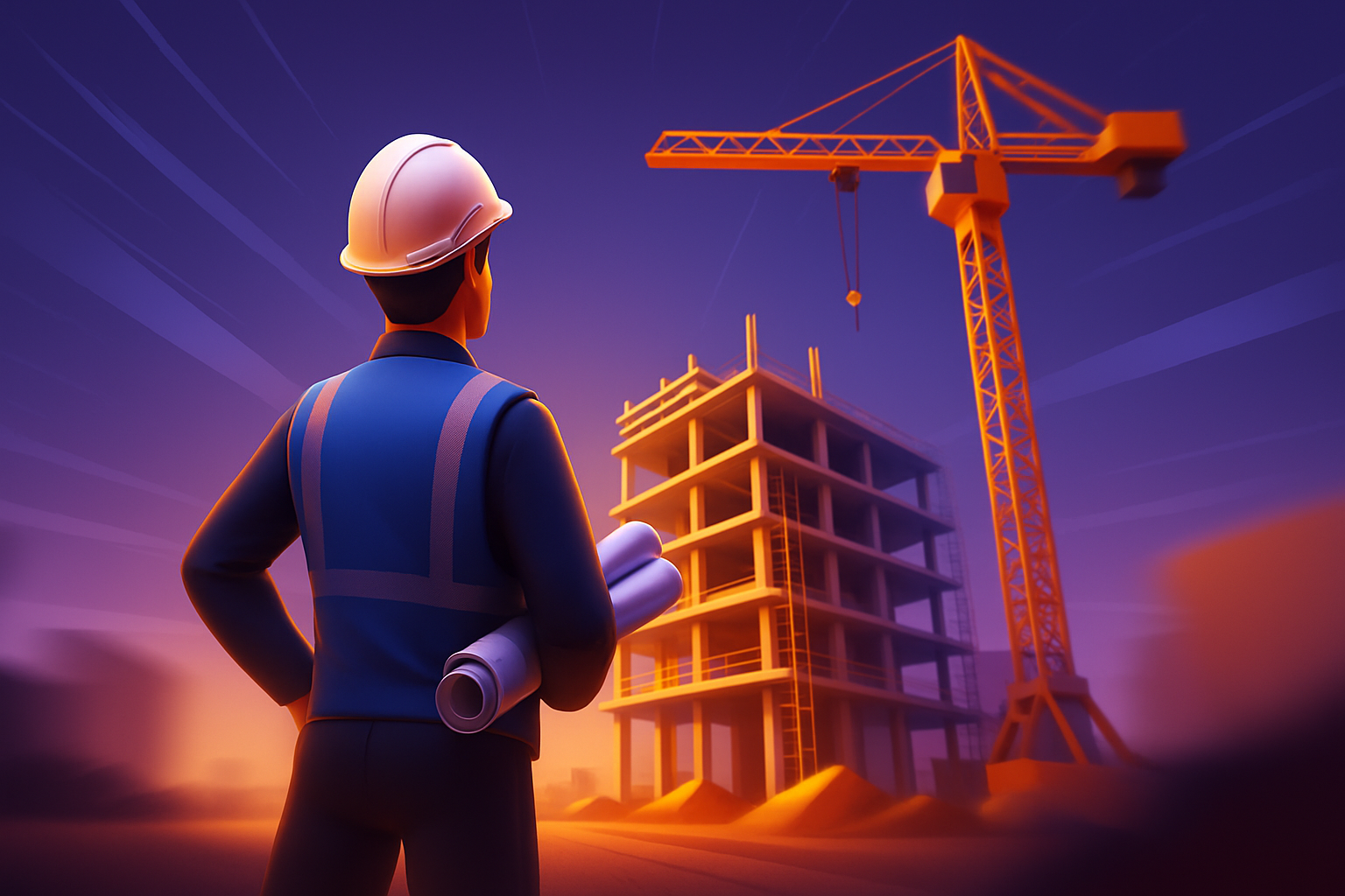 /Collection: /by davooda/Type: PNG/A civil engineer observes a bustling construction site, with a crane and building framework in the background. The scene is depicted with a dynamic angle and vibrant colors.
