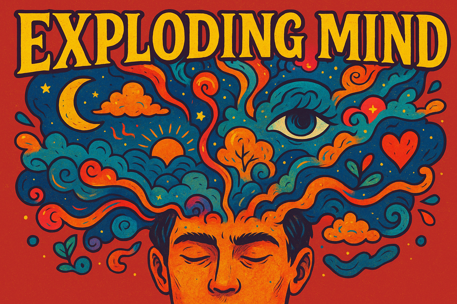 A colorful and imaginative illustration depicting a person with an exploding mind, symbolizing creativity and thought. Ideal for mental health awareness and artistic projects.