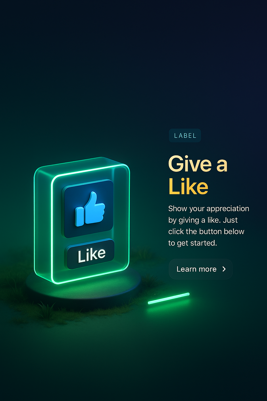 A visually striking 3D scene featuring a glowing 'Like' button with neon accents. The background is dark, enhancing the luminous elements, including a small label and a text block.