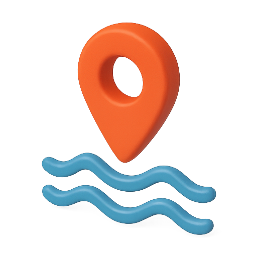 A colorful and modern graphic featuring an orange location pin above blue waves, suitable for navigation apps, travel websites, or mapping services.