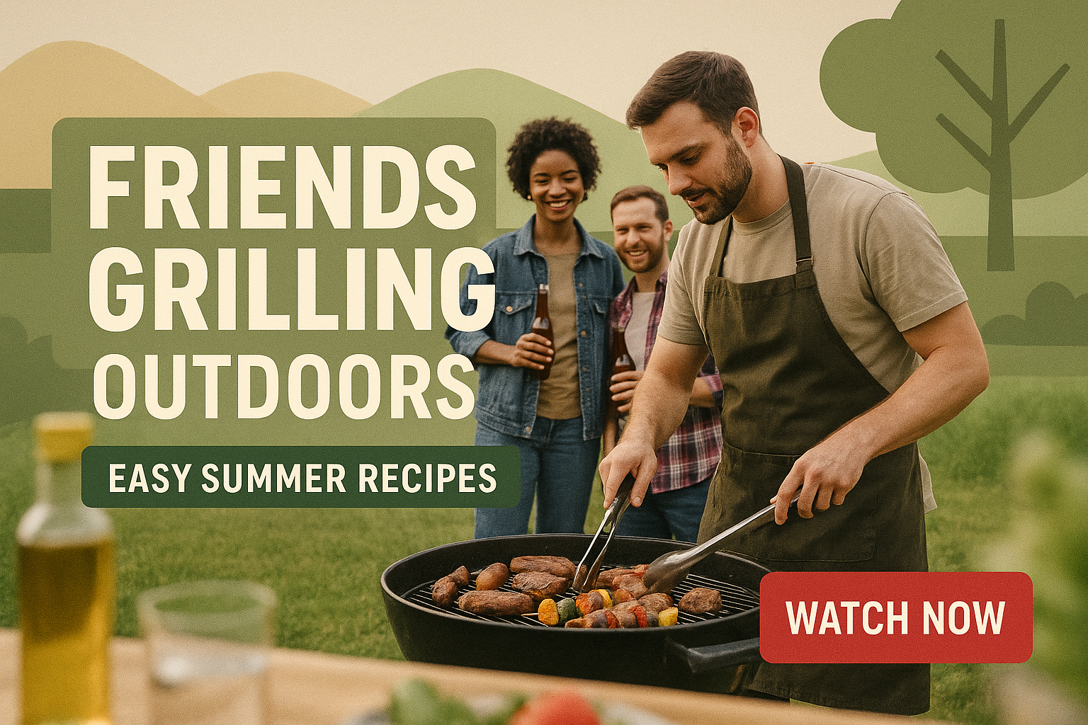 /Collection: /by davooda/Type: PNG/Inviting promotional graphic featuring friends grilling outdoors, perfect for summer recipe videos. The design uses warm colors and a friendly atmosphere to engage viewers.