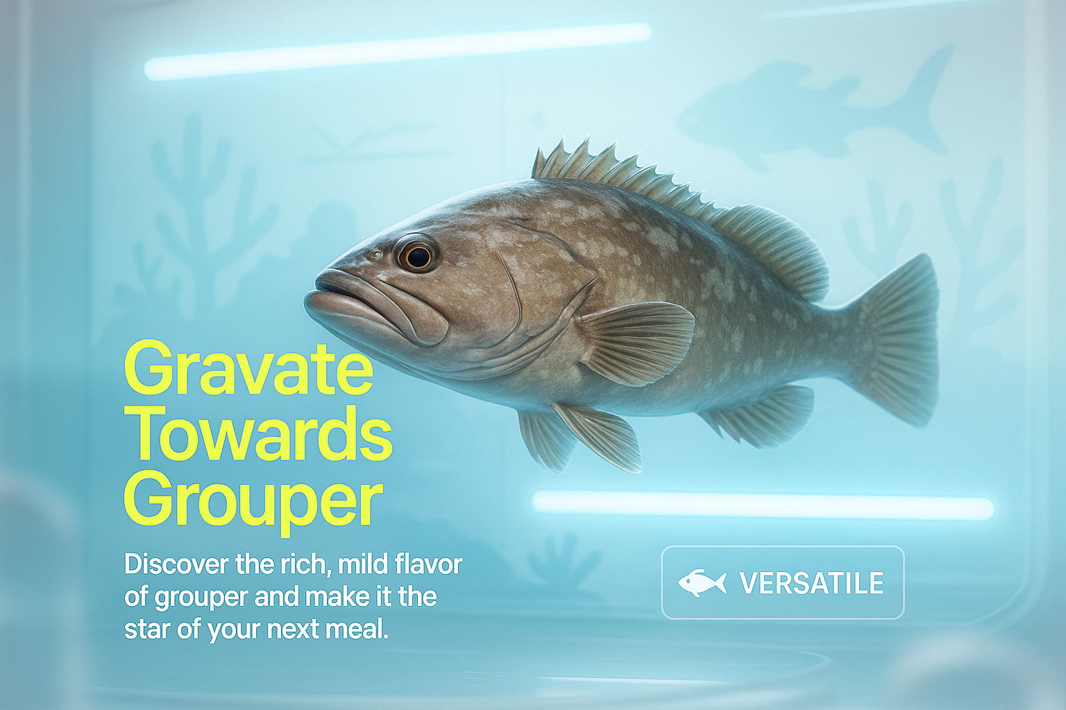 Vibrant promotional image featuring a realistic grouper fish, highlighting its culinary qualities with a modern design. Ideal for seafood marketing or restaurant menus.