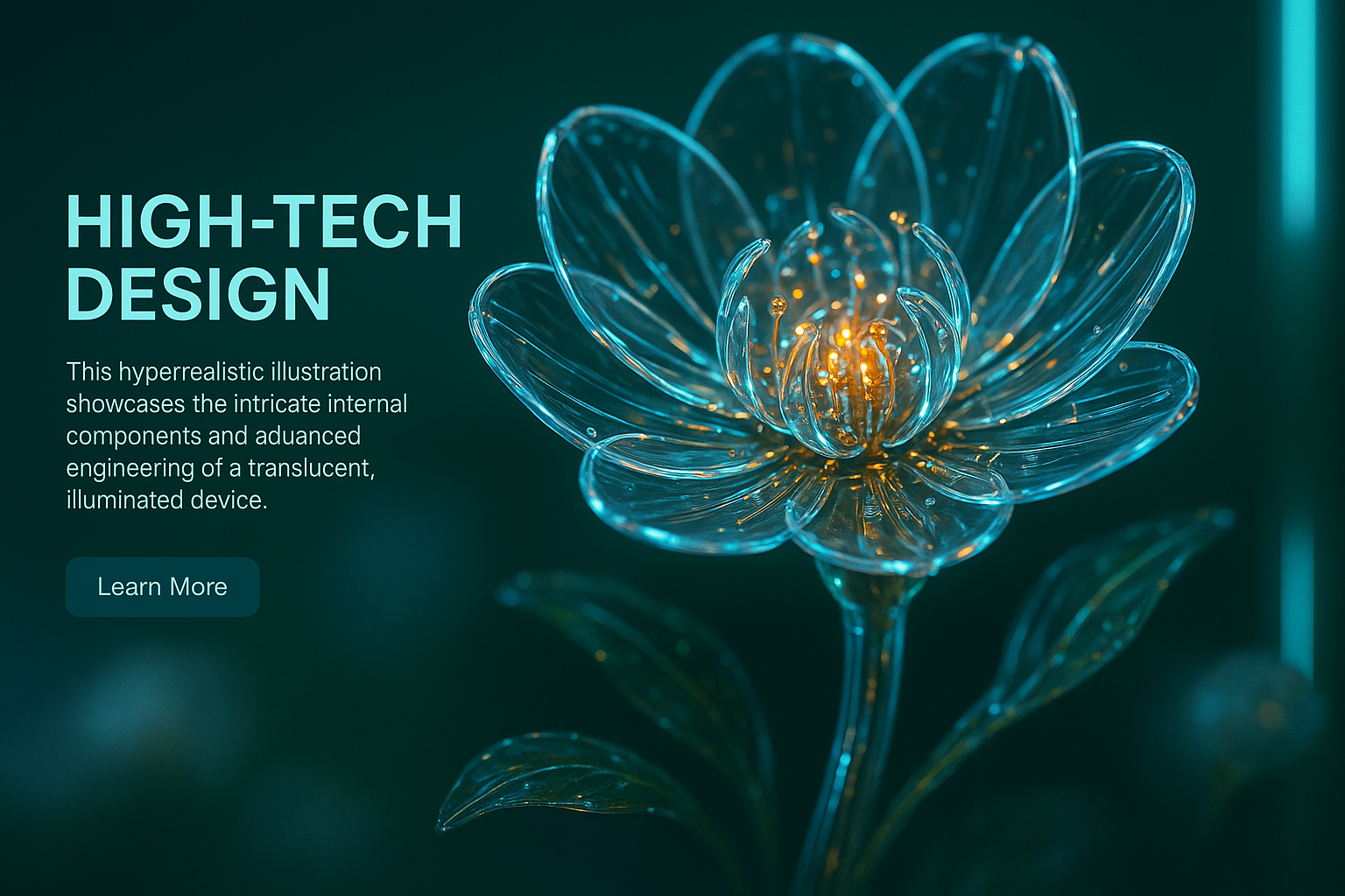 /Collection: /by davooda/Type: PNG/This hyperrealistic illustration depicts a translucent flower, detailed with glowing micro-LEDs and intricate mechanical elements, creating a striking visual. Soft neon accents enhance its beauty.