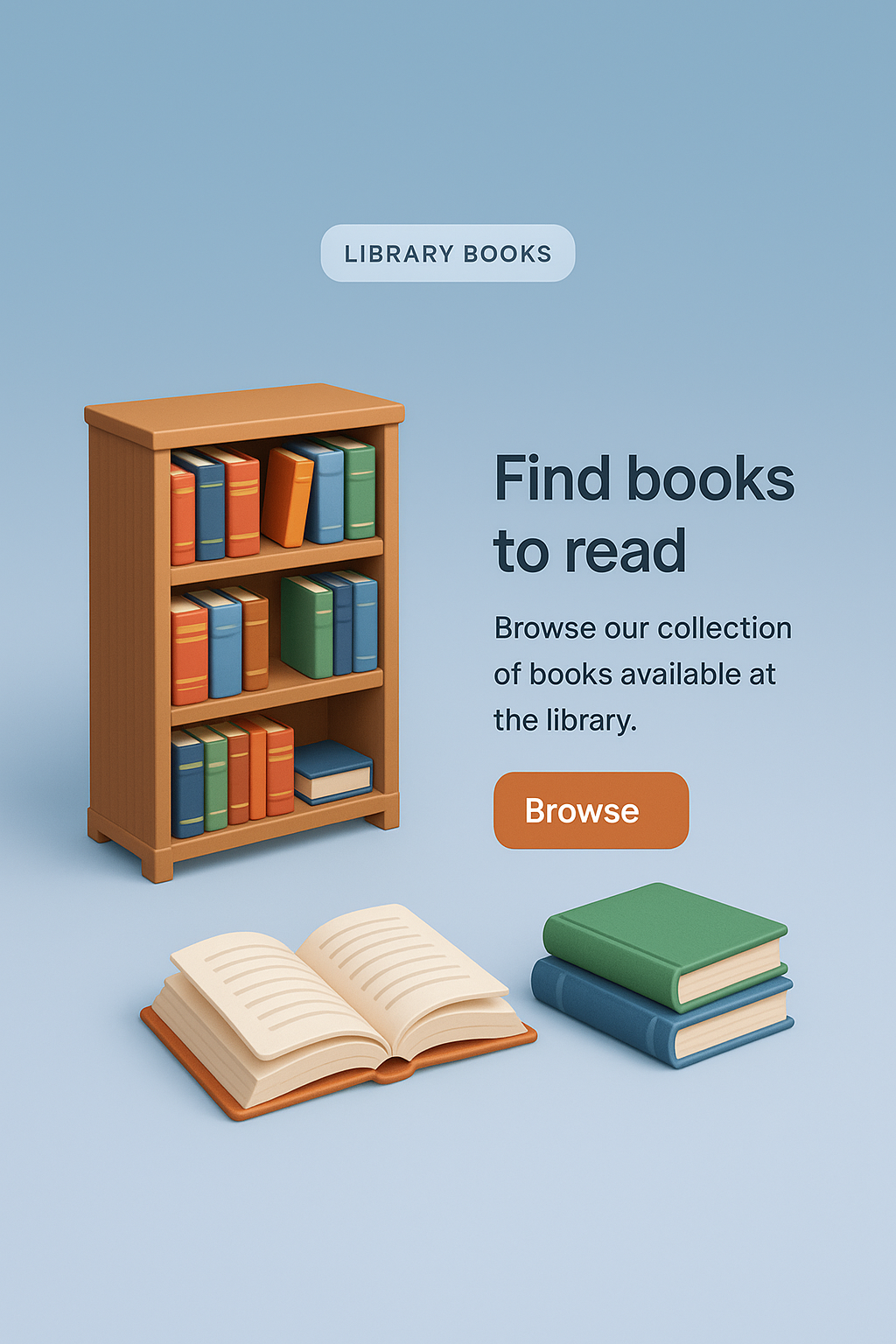 /Collection: /by davooda/Type: PNG/A detailed 3D illustration of a library scene featuring a bookshelf filled with colorful books, an open book, and stacked books. The design emphasizes realism with a smooth gradient background and clear text elements.