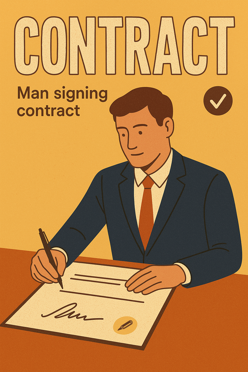 /Collection: /by davooda/Type: PNG/Vector graphic depicting a man in a suit signing a contract, featuring a warm color palette and a modern design style suitable for business-related content.