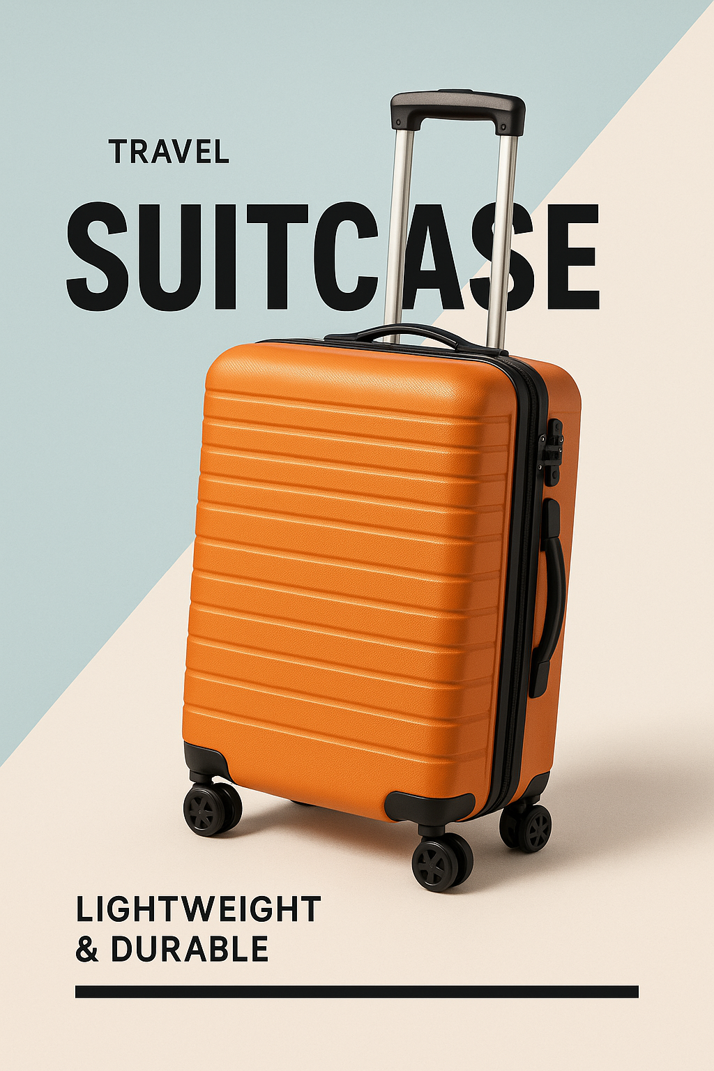 /Collection: /by davooda/Type: PNG/A vibrant advertisement featuring a modern orange suitcase designed for travel. The image showcases the suitcase with realistic lighting against a diagonally divided light-colored background, emphasizing its lightweight and durable features.