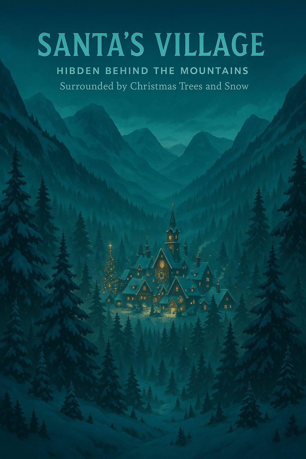/Collection: /by davooda/Type: PNG/A captivating digital painting depicting Santa's Village nestled in a snowy mountainous landscape, perfect for holiday-themed decorations or greeting cards.