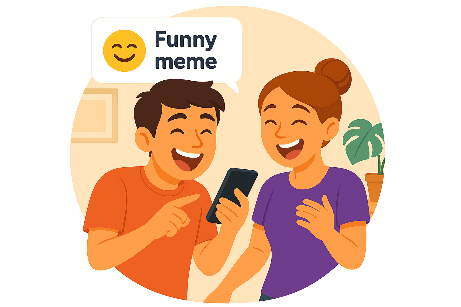Colorful illustration depicting two friends sharing a laugh while looking at a smartphone, ideal for social media and digital communication themes.