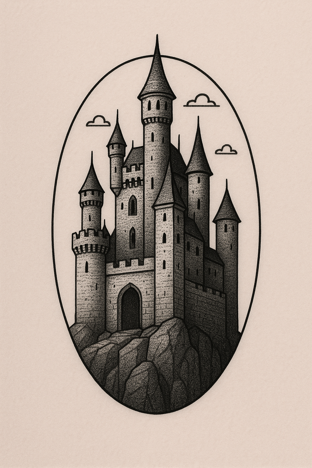 /Collection: /by davooda/Type: PNG/This is a detailed black and white illustration of a castle set within an oval frame. The design features various towers and a rocky base, suited for artistic or fantasy-themed projects.