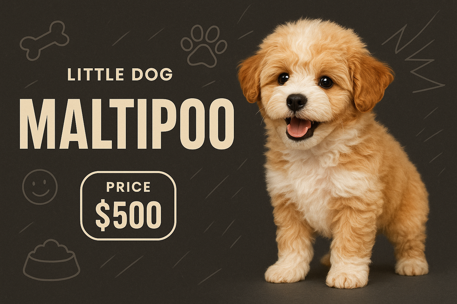 /Collection: /by davooda/Type: PNG/A delightful Maltipoo puppy with a fluffy golden coat smiles against a dark textured background. Accompanied by playful typography and a price tag, it captures attention.