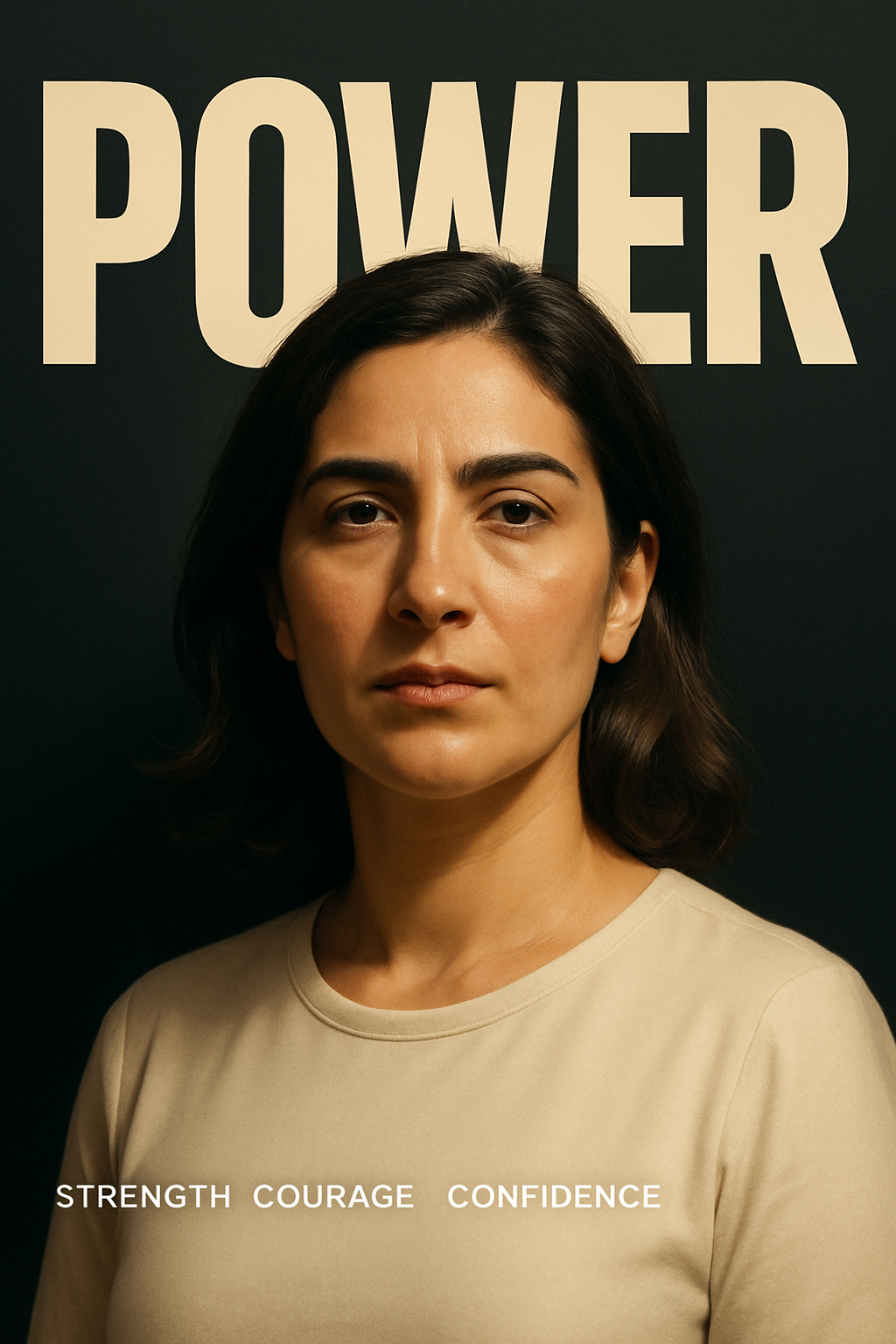 A striking portrayal of a Middle Eastern woman in her 30s against a dark background, exuding confidence. The composition features bold typography emphasizing 'POWER' and additional motivational words.