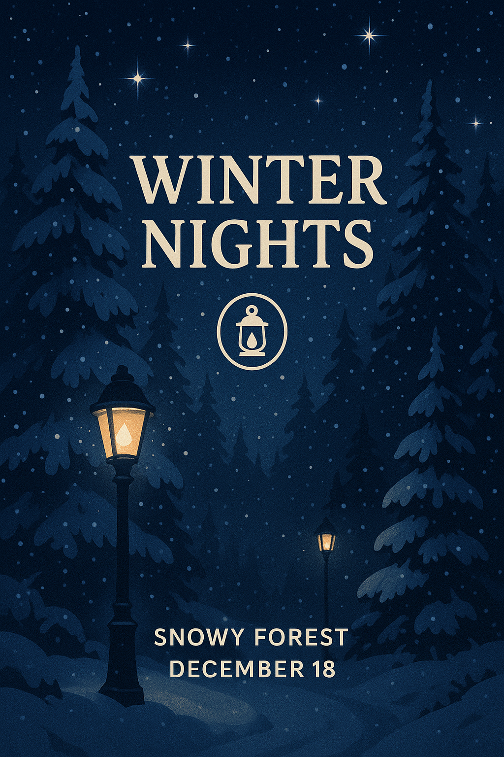 A serene promotional poster depicting a snowy forest at night, featuring stylized lanterns and a calming blue color palette. Ideal for winter event marketing.