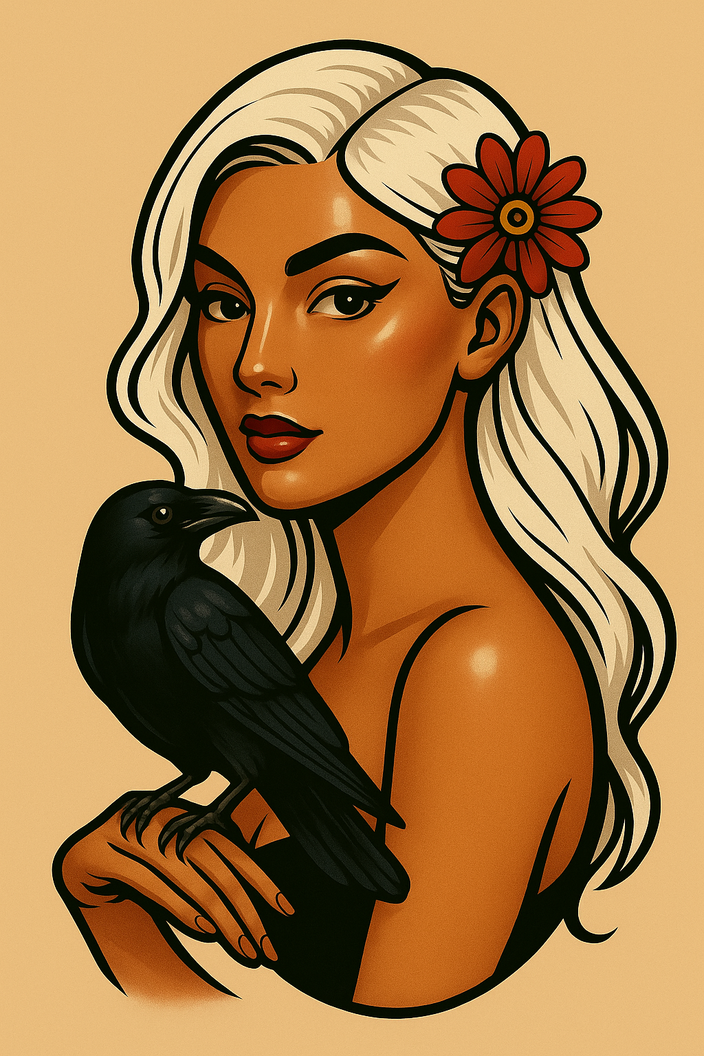 /Collection: /by davooda/Type: PNG/A striking illustration featuring a girl with white hair and a crow perched on her arm. The background is a soft beige, enhancing the glossy, tattoo-inspired aesthetic with anime-like highlights.