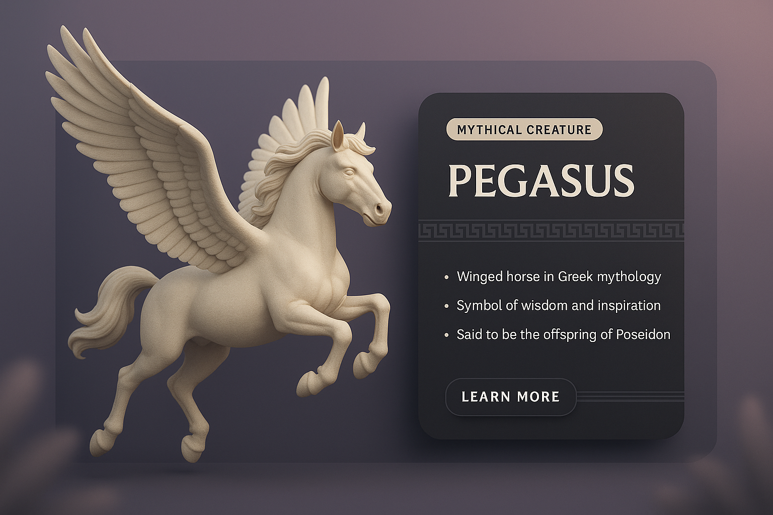 /Collection: /by davooda/Type: PNG/A captivating 3D illustration of Pegasus, the mythical winged horse, integrated with a dark design block featuring text and graphics. The background transitions smoothly, enhancing the visual appeal.