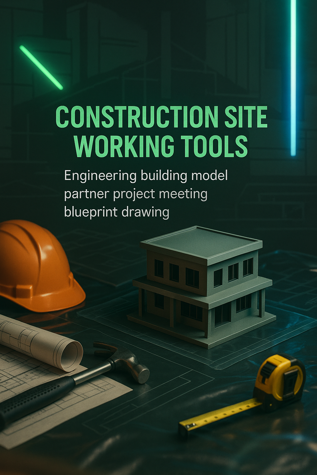 /Collection: /by davooda/Type: PNG/A visually appealing representation of construction tools and architectural blueprints, ideal for engineering or project management contexts. The image features a model building, hard hat, and measuring tape, creating a professional atmosphere.