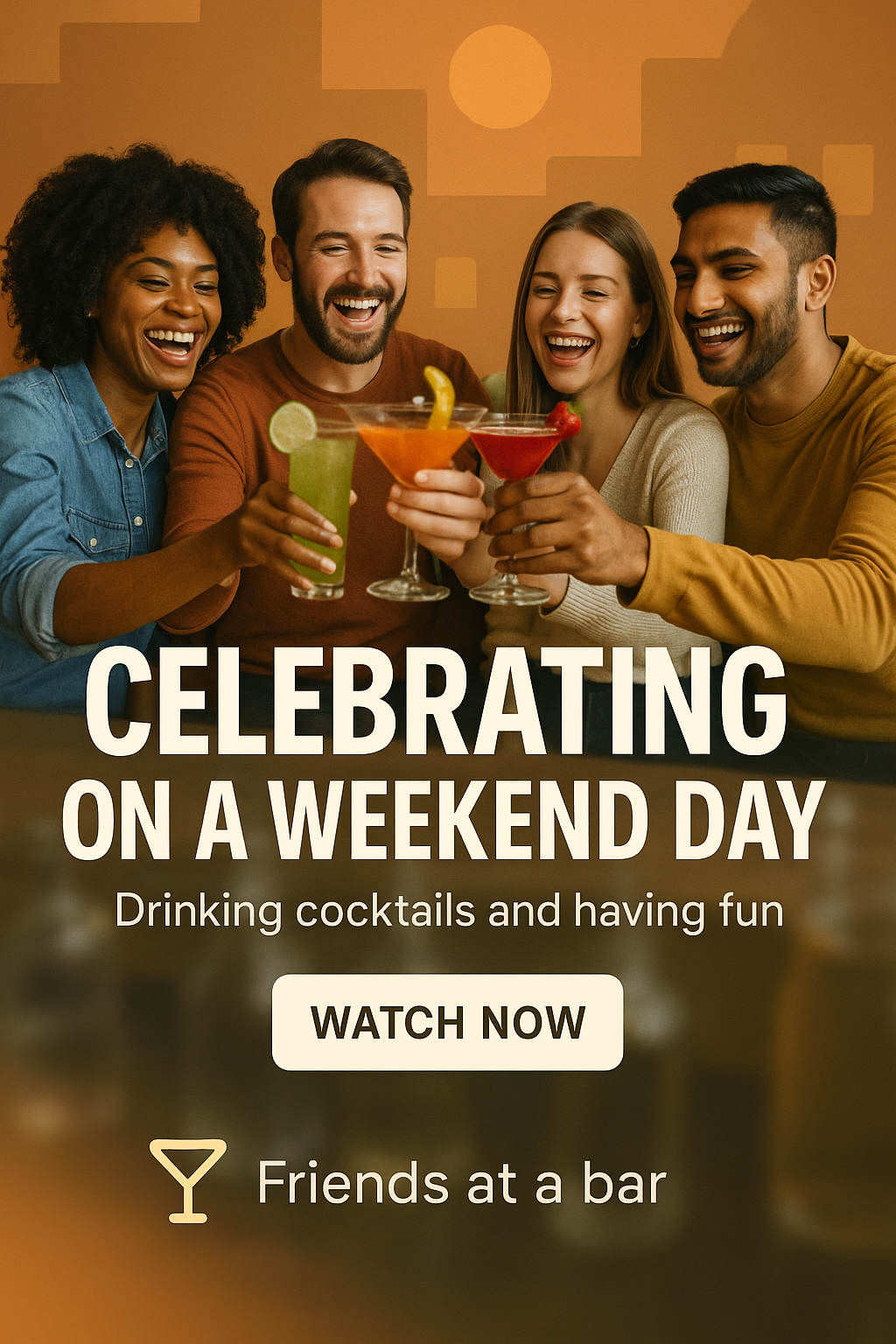 /Collection: /by davooda/Type: PNG/Vibrant social media post showcasing friends celebrating at a bar with cocktails. The warm colors and joyful expressions evoke a fun, relaxed atmosphere ideal for promoting nightlife and social events.