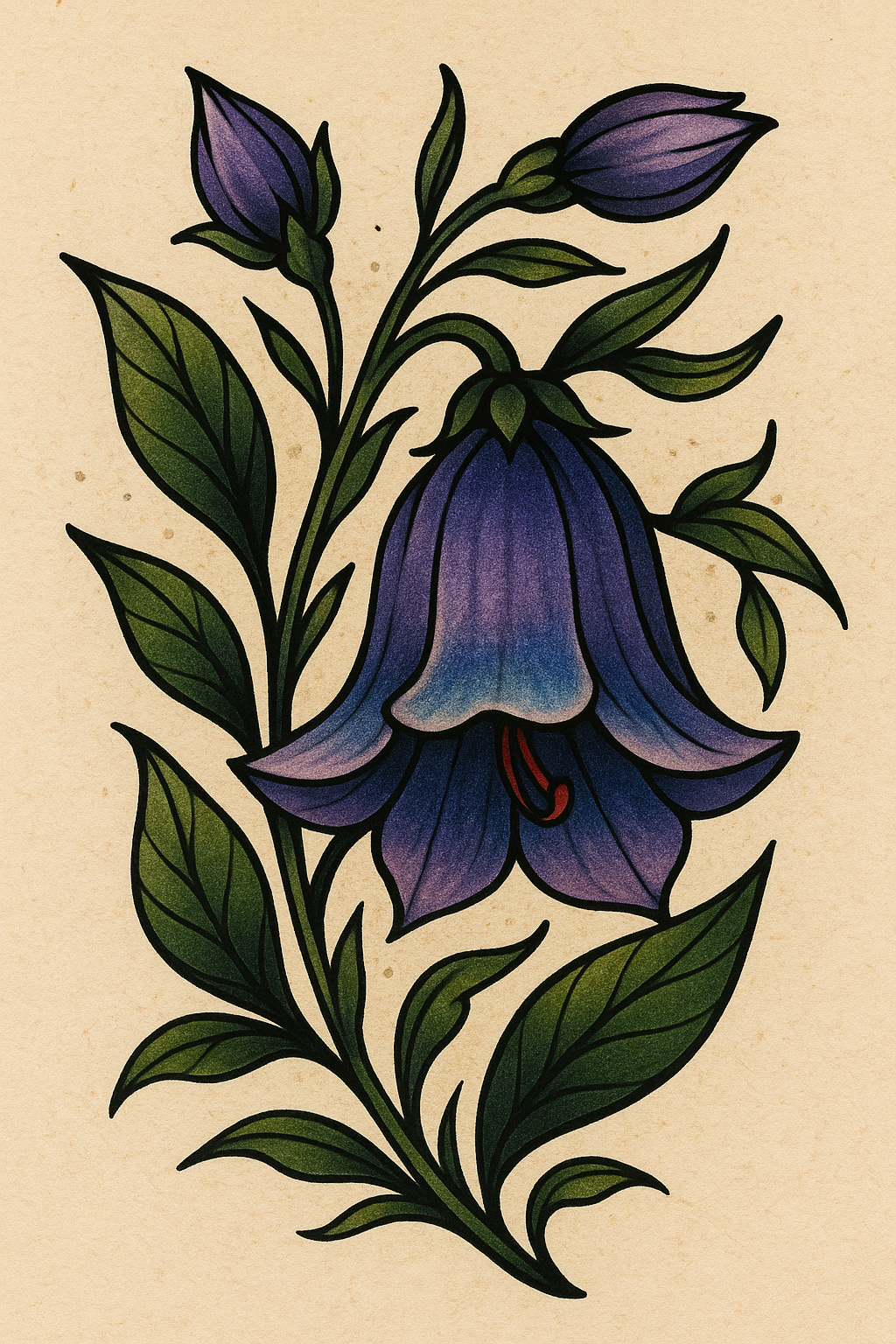 Beautiful botanical illustration of a bellflower with leaves