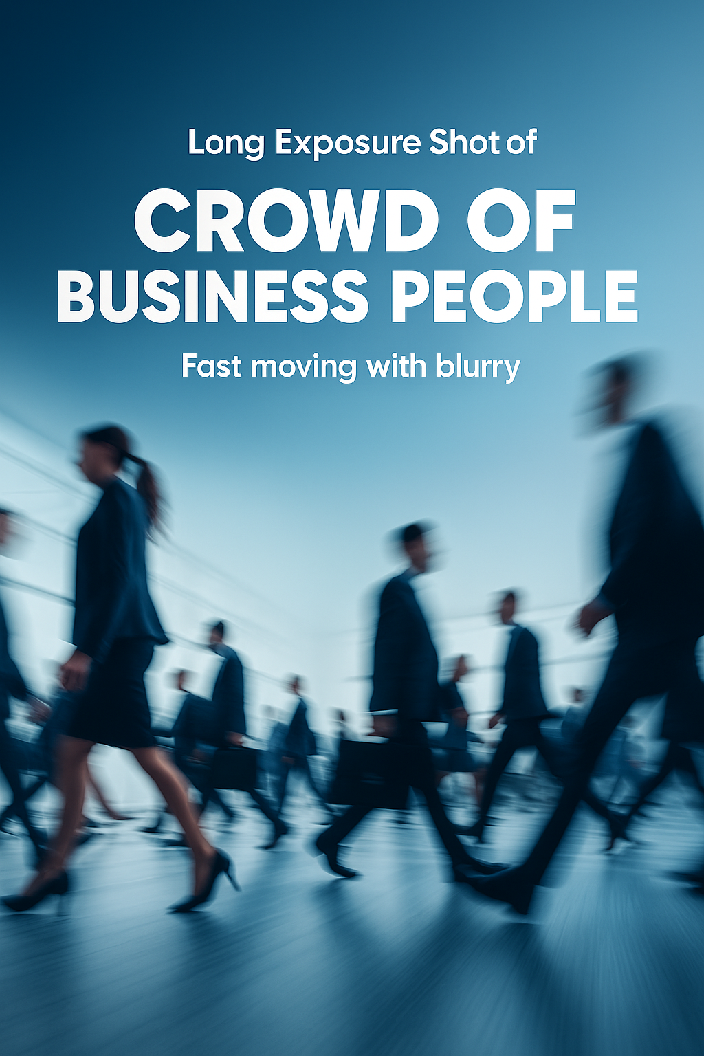 A long exposure shot capturing a dynamic crowd of business people walking swiftly through a bright office lobby. The blurred motion emphasizes their speed and energy, creating a vibrant atmosphere.