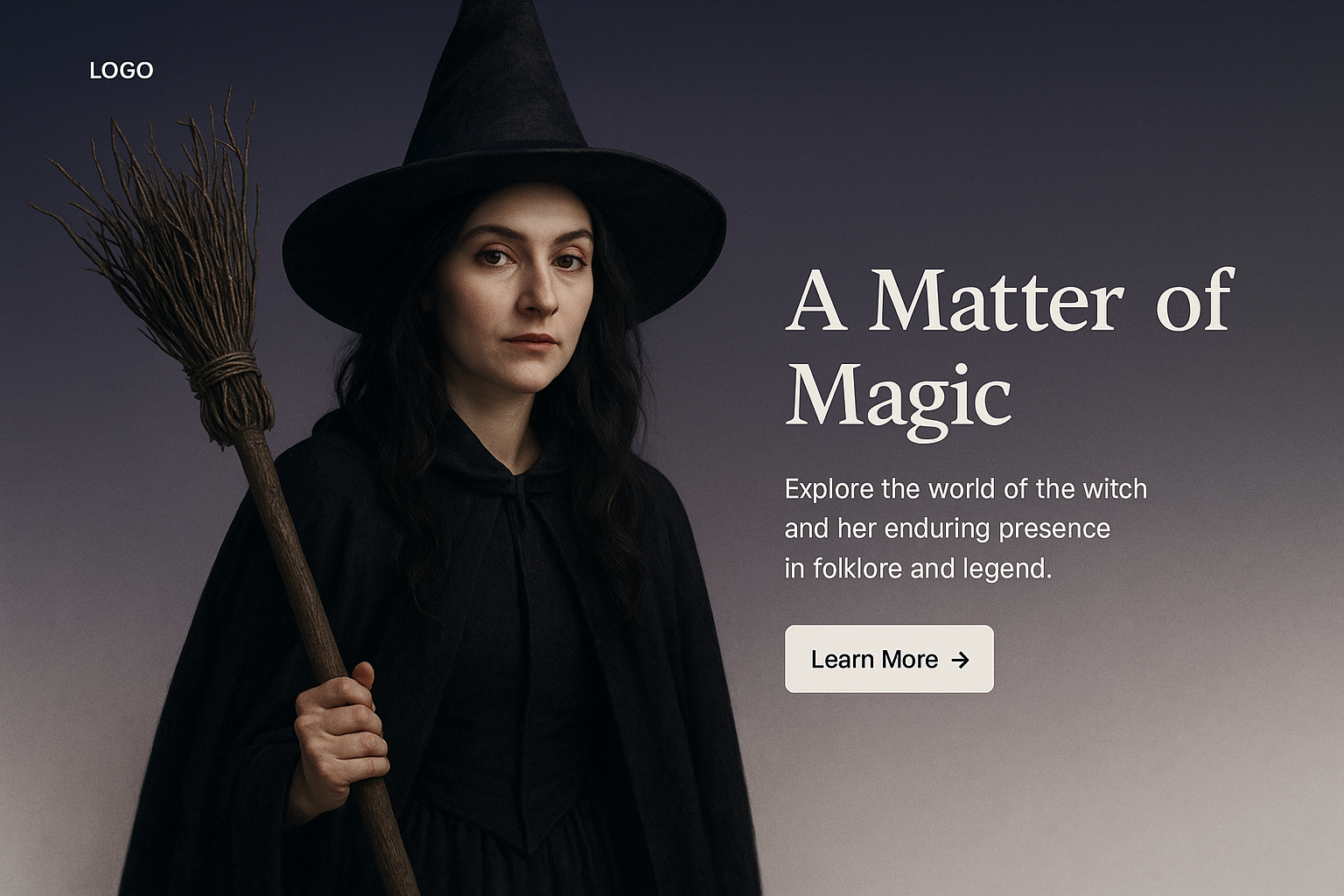 A stylish illustration of a witch holding a broom, set against a gradient background. Includes a text block and action button, designed for a web page layout.