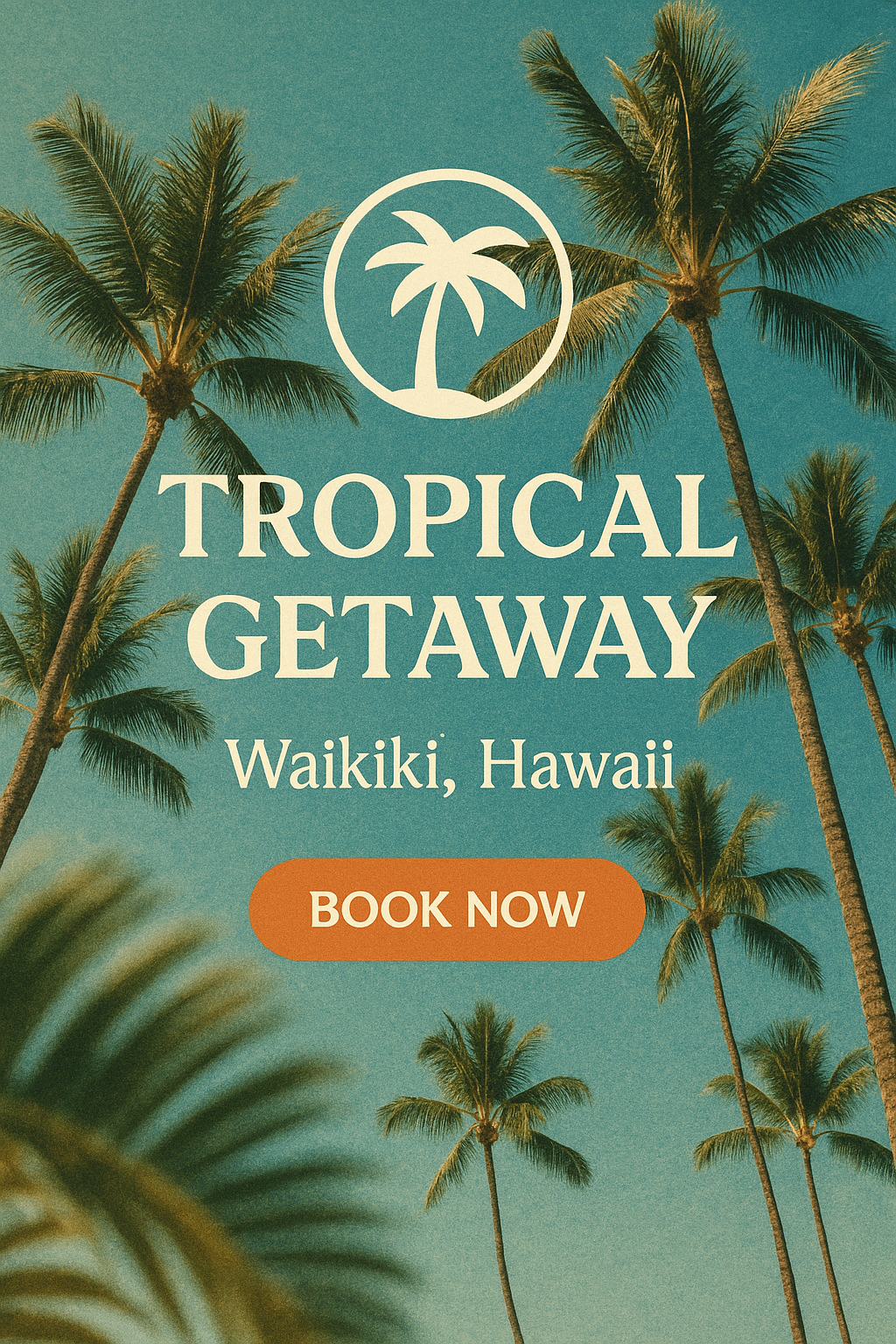A vibrant promotional graphic showcasing a tropical getaway theme with palm trees and a soothing color palette, ideal for travel marketing and vacation promotions.