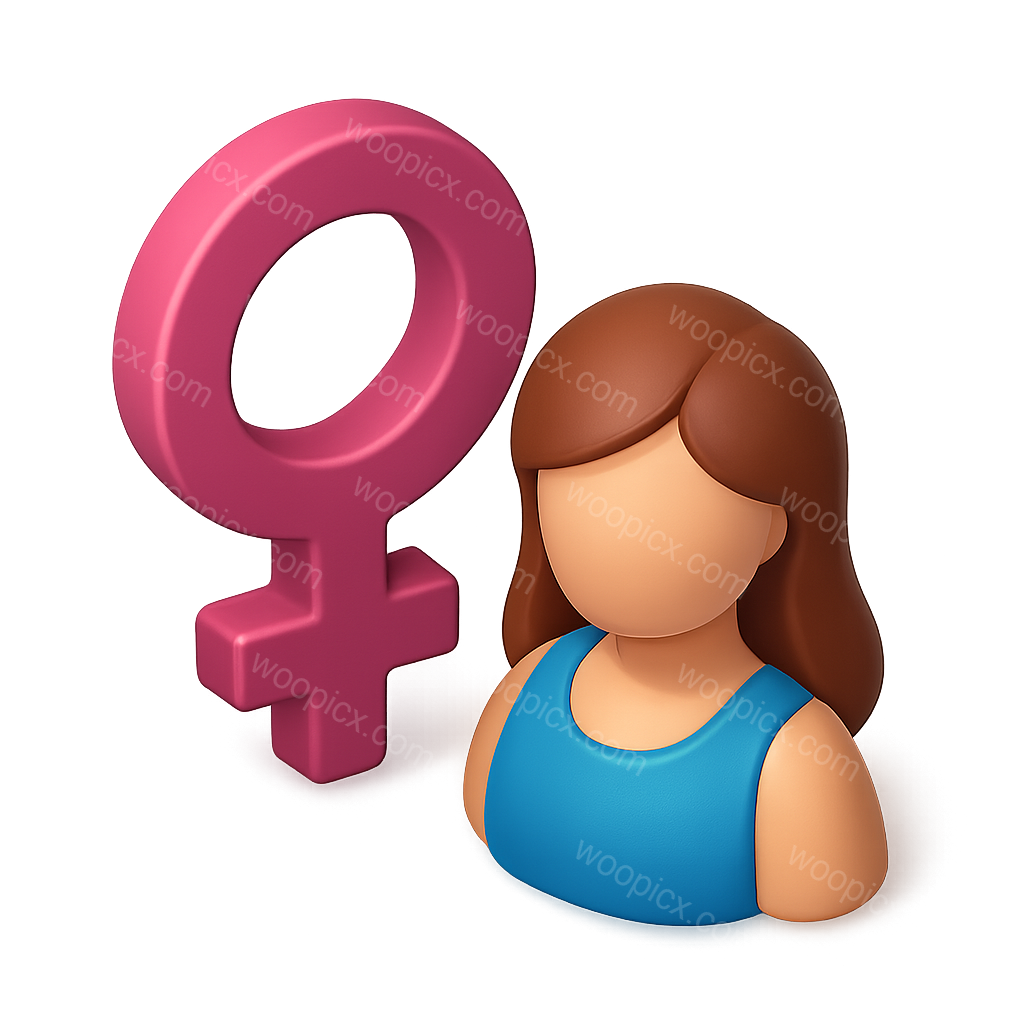 /Premium/Collection: /by davooda/Type: PNG/A stylized 3D icon depicting a female figure alongside a pink female symbol. The figure features a volumetric design with a blue top, rendered in a three-quarter view.