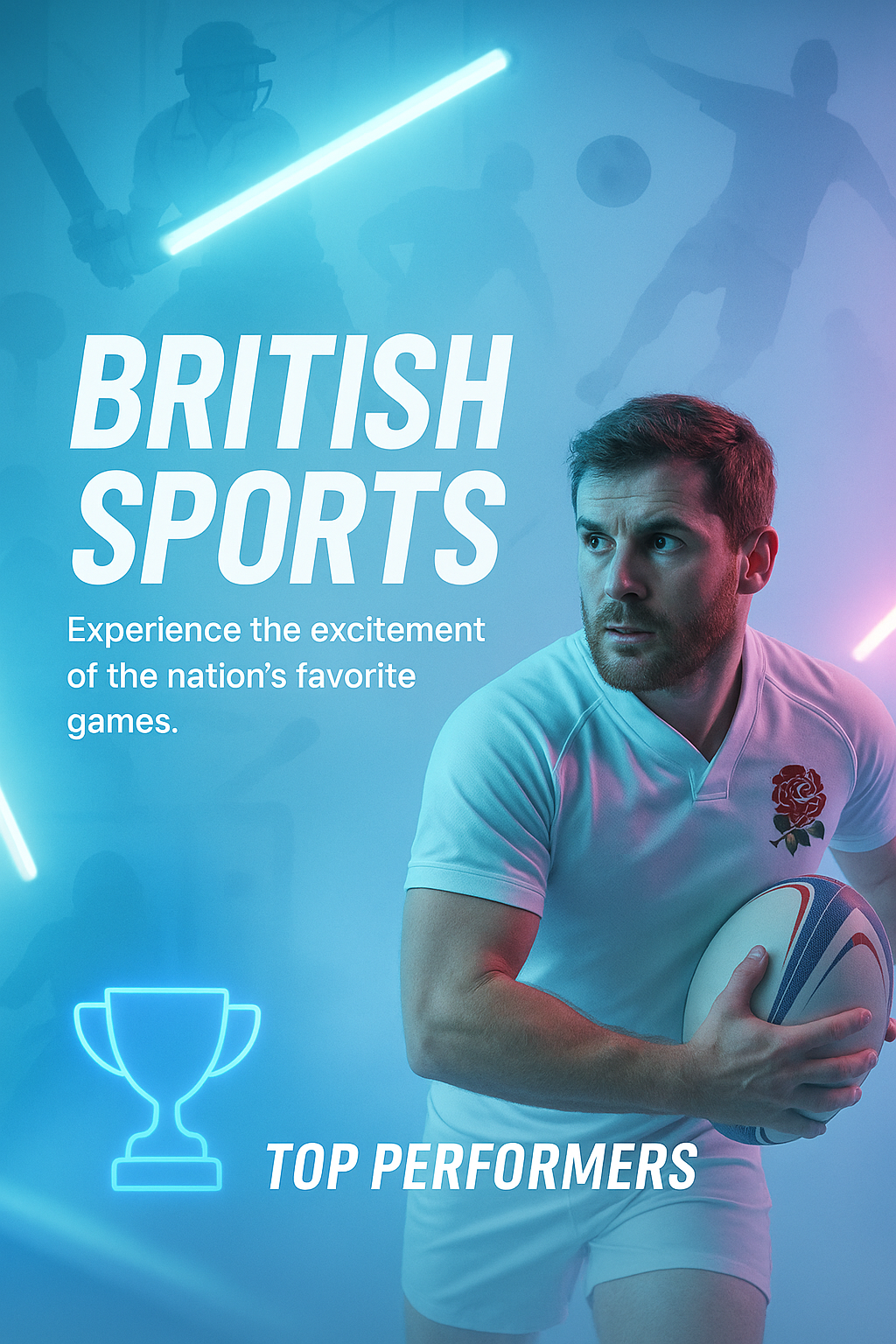 /Collection: /by davooda/Type: PNG/Vibrant promotional graphic showcasing British sports, focusing on rugby. The design combines bold typography and dynamic lighting to evoke excitement, ideal for engaging sports enthusiasts.