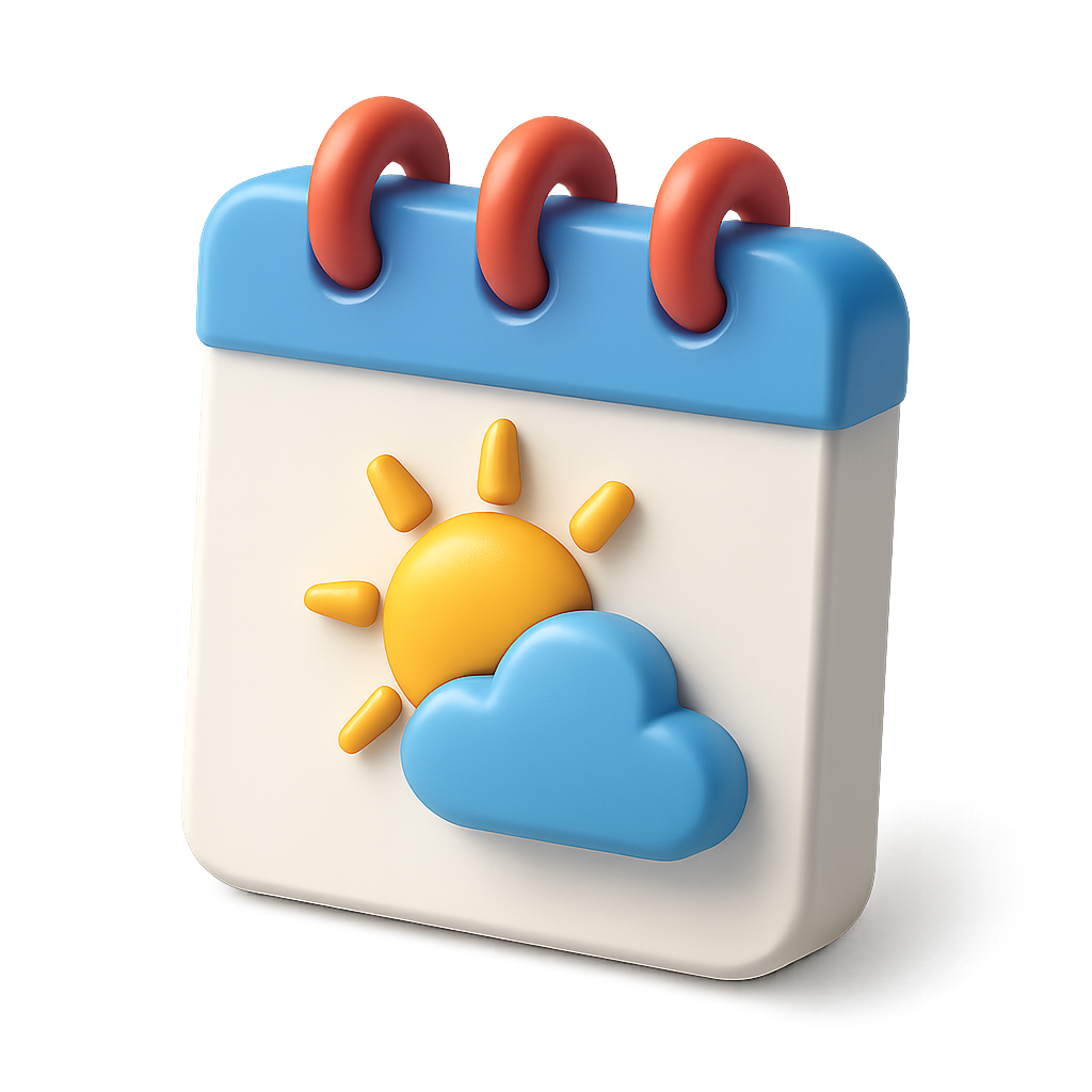 A vibrant 3D calendar icon designed in a three-quarter view. It features a sun and cloud, symbolizing a tomorrow theme, with a playful and volumetric style.