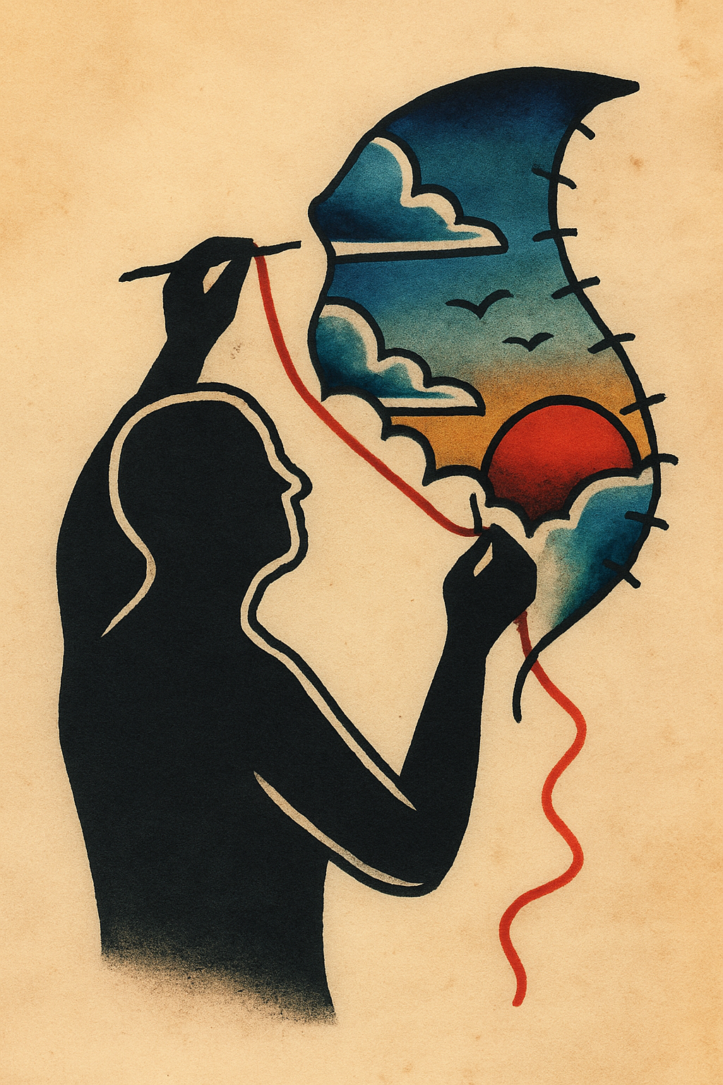 /Collection: /by davooda/Type: PNG/A striking silhouette of a figure attempting to mend a hole in the sky, depicted as a colorful tattoo design. The background features soft beige tones, enhancing the vibrant hues of the clouds and sun.