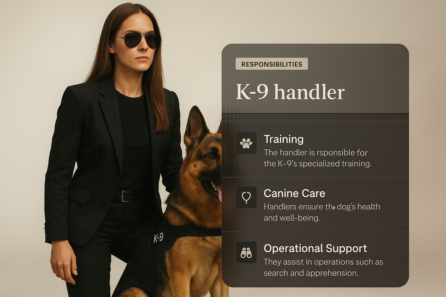 /Collection: /by davooda/Type: PNG/A chic K-9 handler in a stylish black suit and sunglasses stands next to a German Shepherd. An overlay box outlines key responsibilities, ensuring a modern and elegant presentation.