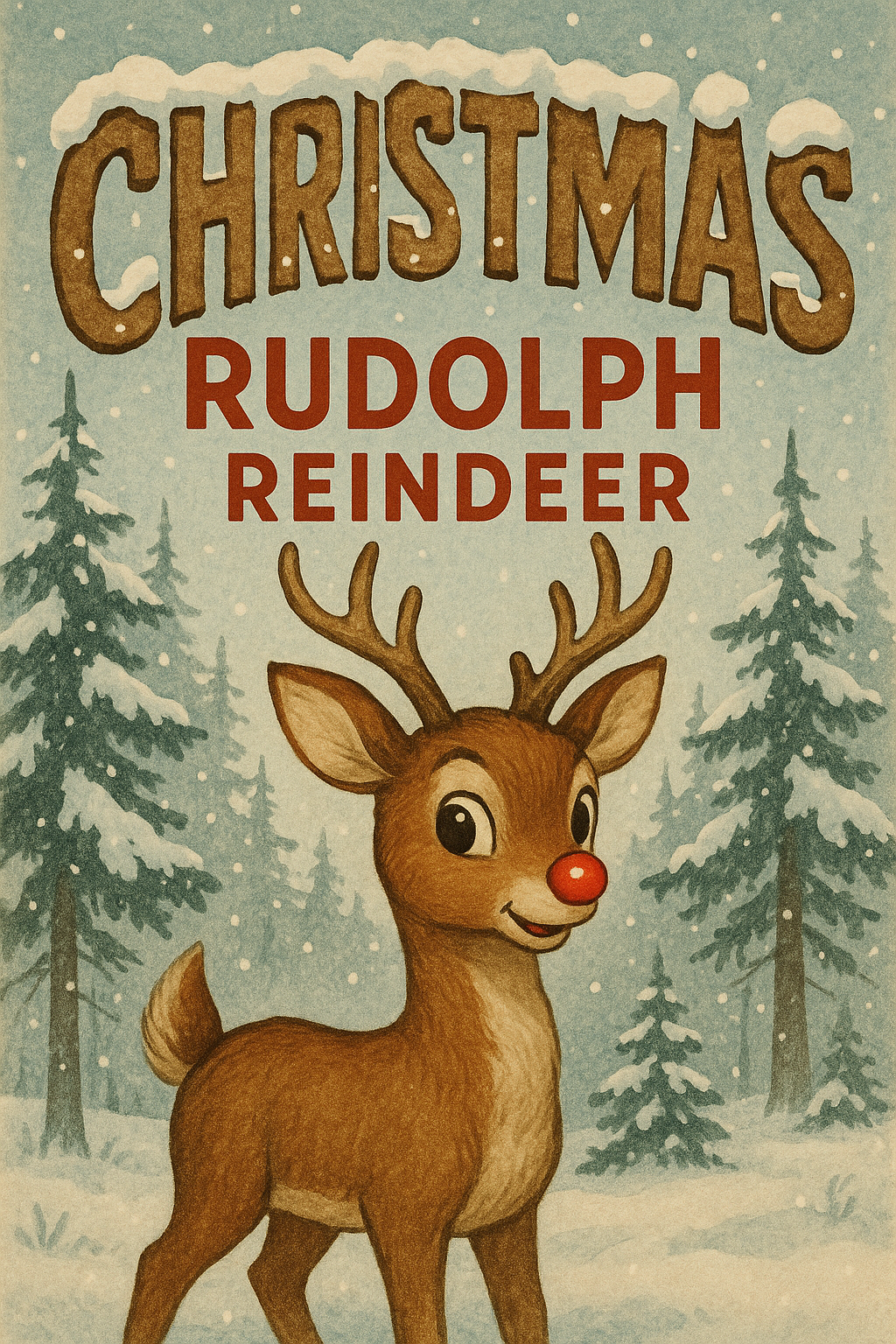 Charming vintage-style illustration of Rudolph the Reindeer in a snowy landscape, perfect for holiday greeting cards or festive decorations.