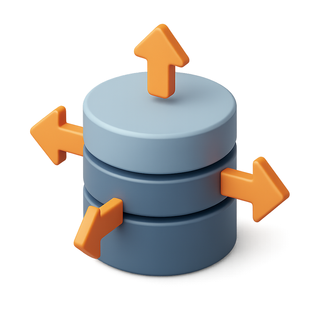 A visually appealing 3D icon depicting a data storage unit with orange directional arrows pointing outward. The isometric design enhances the volumetric effect, ideal for tech-related themes.