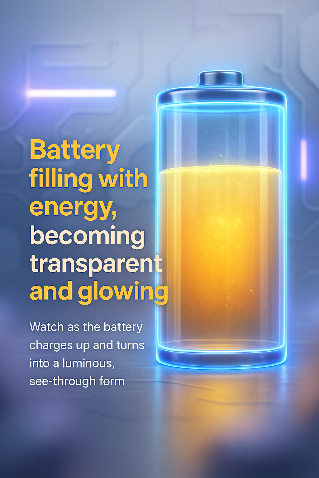 Illustrative graphic showcasing a battery charging and becoming luminous. The modern design features a translucent effect with vibrant colors, ideal for tech-related content.