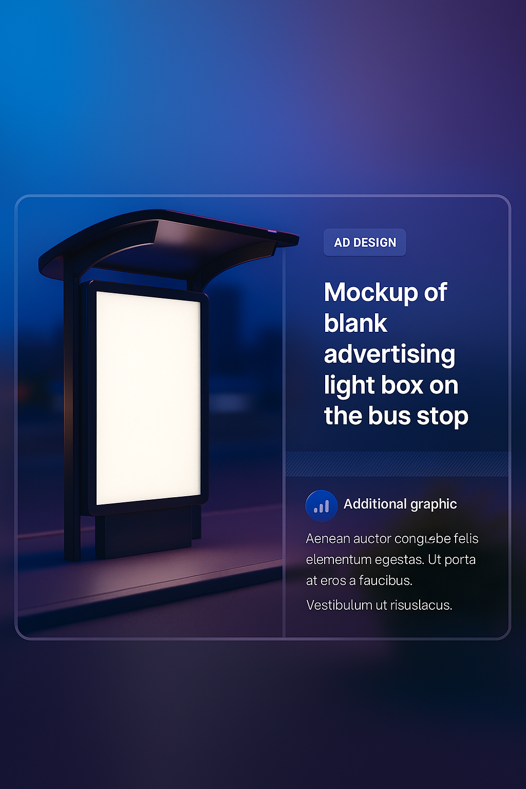 /Collection: /by davooda/Type: PNG/A realistic 3D mockup featuring a blank advertising light box situated at a bus stop. The design includes a gradient background and additional graphics for a modern touch.