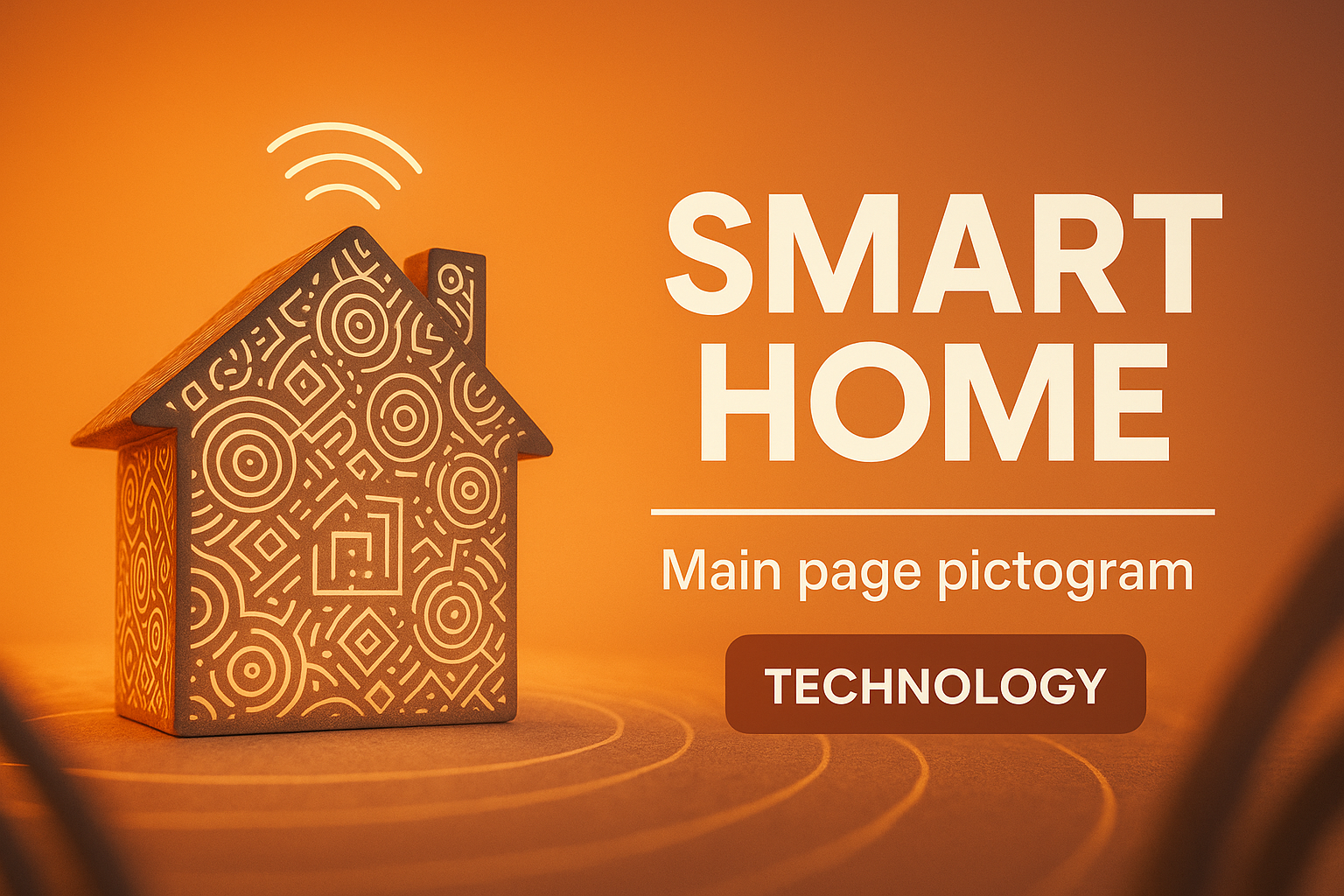 Modern pictogram representing a smart home concept, featuring warm lighting and intricate designs. Ideal for technology-related applications and marketing.