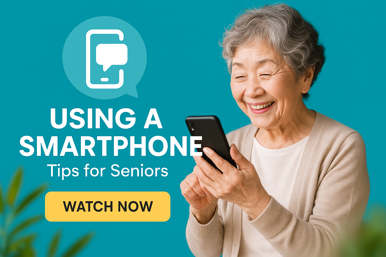 /Collection: /by davooda/Type: PNG/A vibrant social media post aimed at seniors, featuring a smiling elderly woman using a smartphone. The graphic promotes tips for smartphone use, combining friendly visuals with an inviting call-to-action.