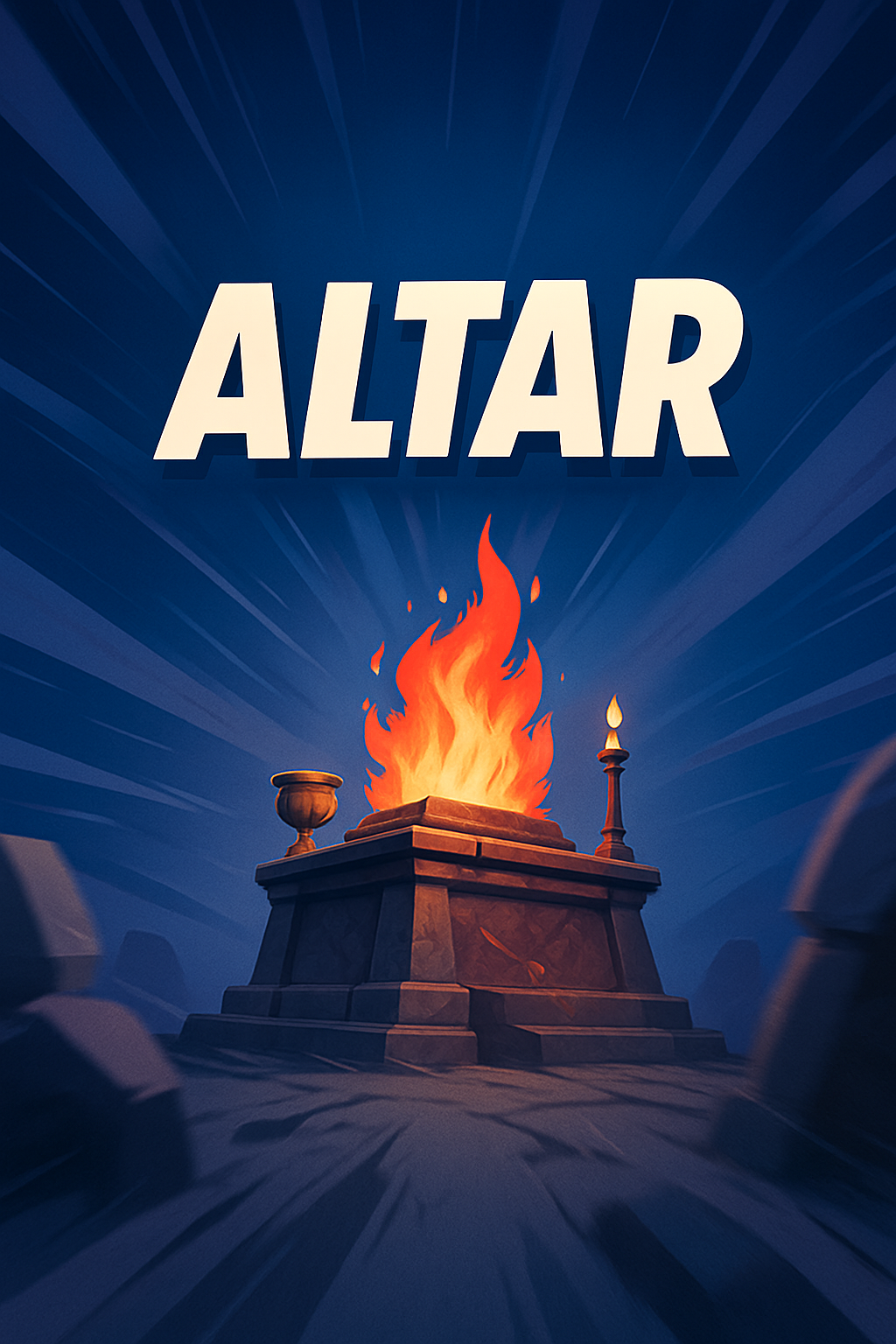 A vibrant altar scene featuring dynamic lines radiating from a central flame. The bold title 'ALTAR' stands out against a gradient background, creating a striking visual impact.