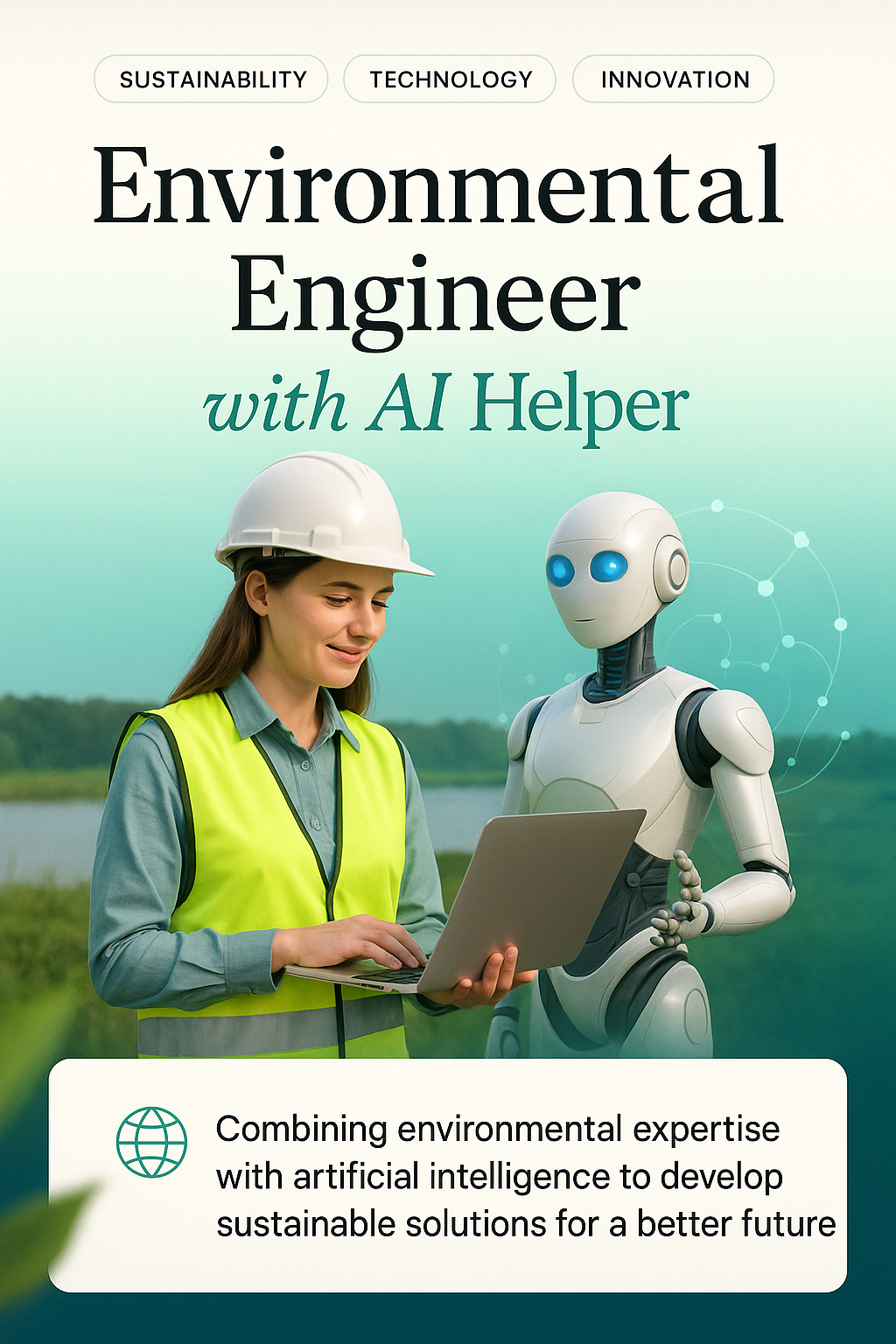 /Collection: /by davooda/Type: PNG/An environmental engineer in a safety vest interacts with an AI robot, both focused on sustainable solutions. The background features a nature scene, emphasizing innovation in technology.