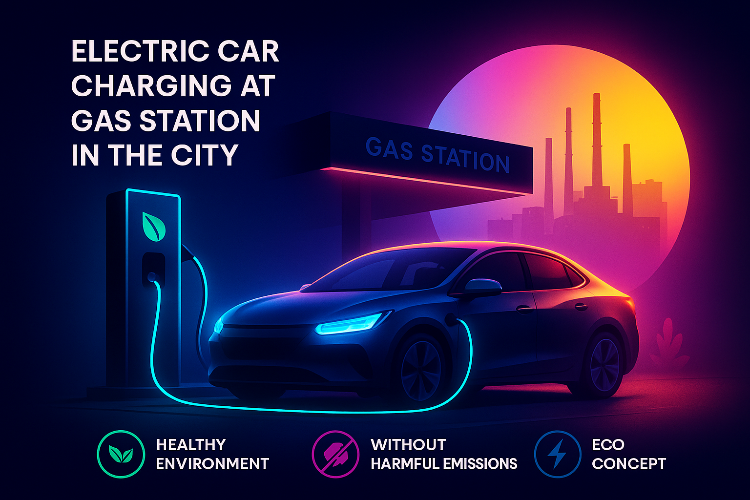 /Collection: /by davooda/Type: PNG/An electric car is charging at a futuristic gas station, surrounded by an industrial landscape. Neon elements and a bright gradient backdrop emphasize the eco-friendly theme.