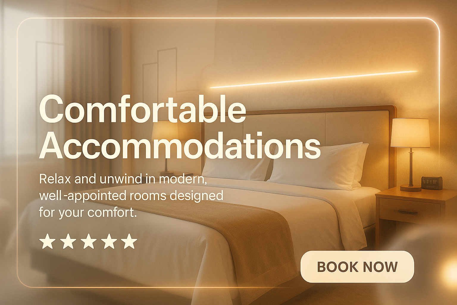 Inviting promotional banner showcasing comfortable hotel accommodations with warm lighting, ideal for attracting potential guests to book a stay.